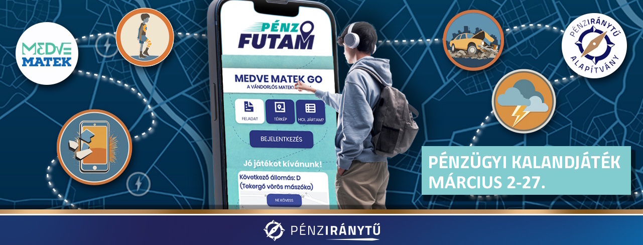 A Pénziránytű Alapítvány a Medve Matek csapatával együttműködésben a PÉNZ7 Pénzügyi és vállalkozói témahét kísérőeseményeként újra megnyitja az országosan elérhető PénzFutam pályákat. Ezúttal is izgalmas pénzügyi-matekos szabadtéri kalandra invitáljuk a 4-14. évfolyamos diákokat és tanáraikat. Az ország közel 260 pontján elérhető PénzFutam egy tanóra, azaz 45 perc alatt ismerteti meg játékosan a diákokkal a mindennapi pénzügyi alapokat. Idén is webináriummal segítjük, hogy pénzügyi tudatosságot fejlesztő közösségi élménnyel ajándékozhassa meg osztályát.