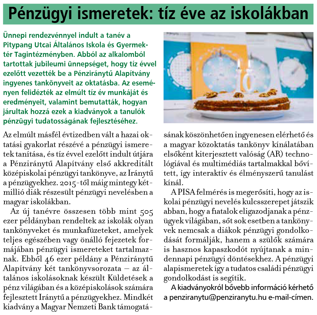 Ünnepi rendezvénnyel indult a tanév a Pitypang Utcai Általános Iskola és Gyermektér Tagintézményben. Abból az alkalomból tartottak jubileumi ünnepséget, hogy tíz évvel ezelőtt vezették be a Pénziránytű Alapítvány ingyenes tankönyveit az oktatásba. Az eseményen felidézték az elmúlt tíz év munkáját és eredményeit, valamint bemutatták, hogyan járultak hozzá ezek a kiadványok a tanulók pénzügyi tudatosságának fejlesztéséhez.